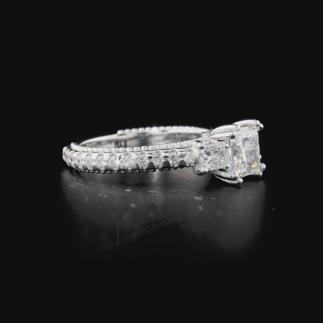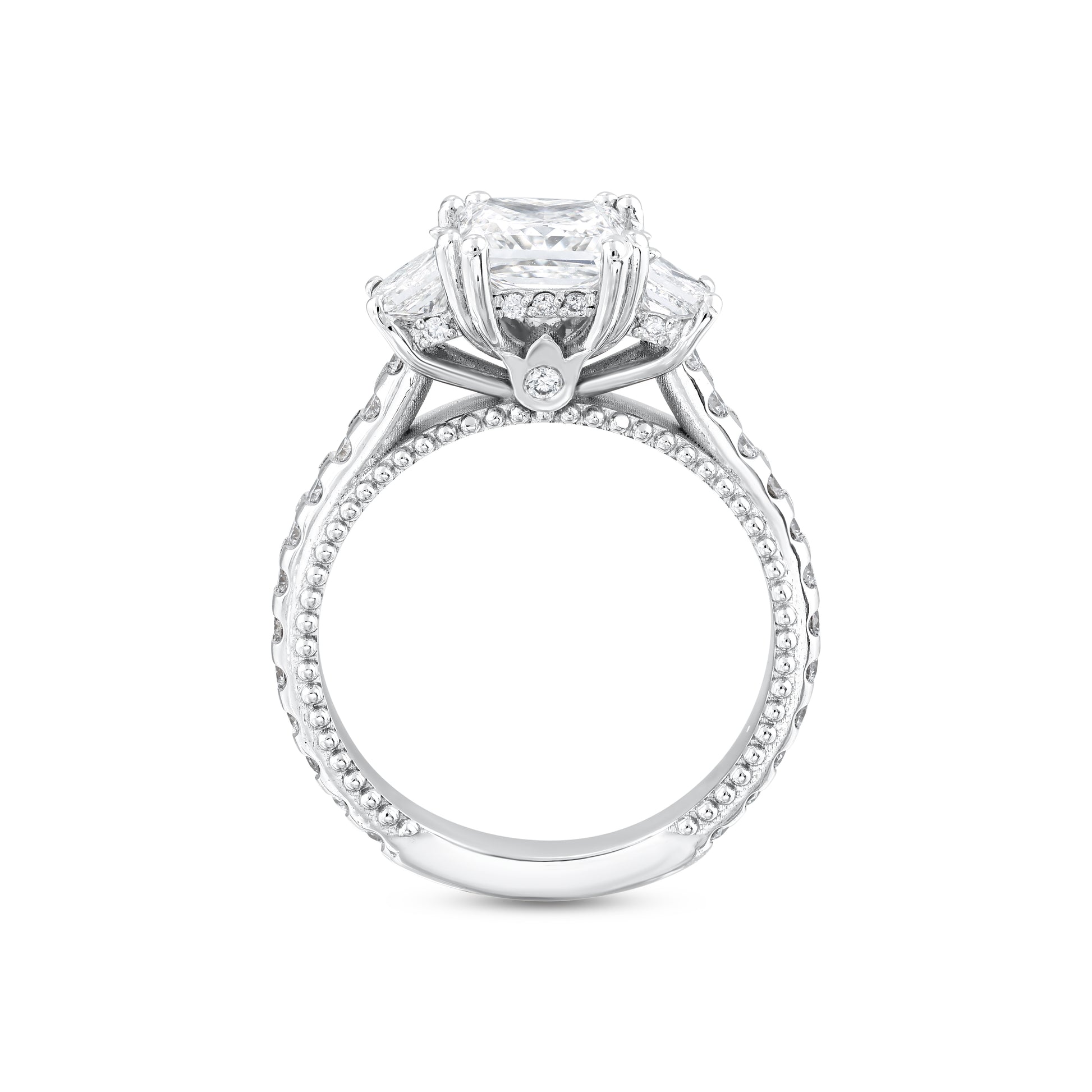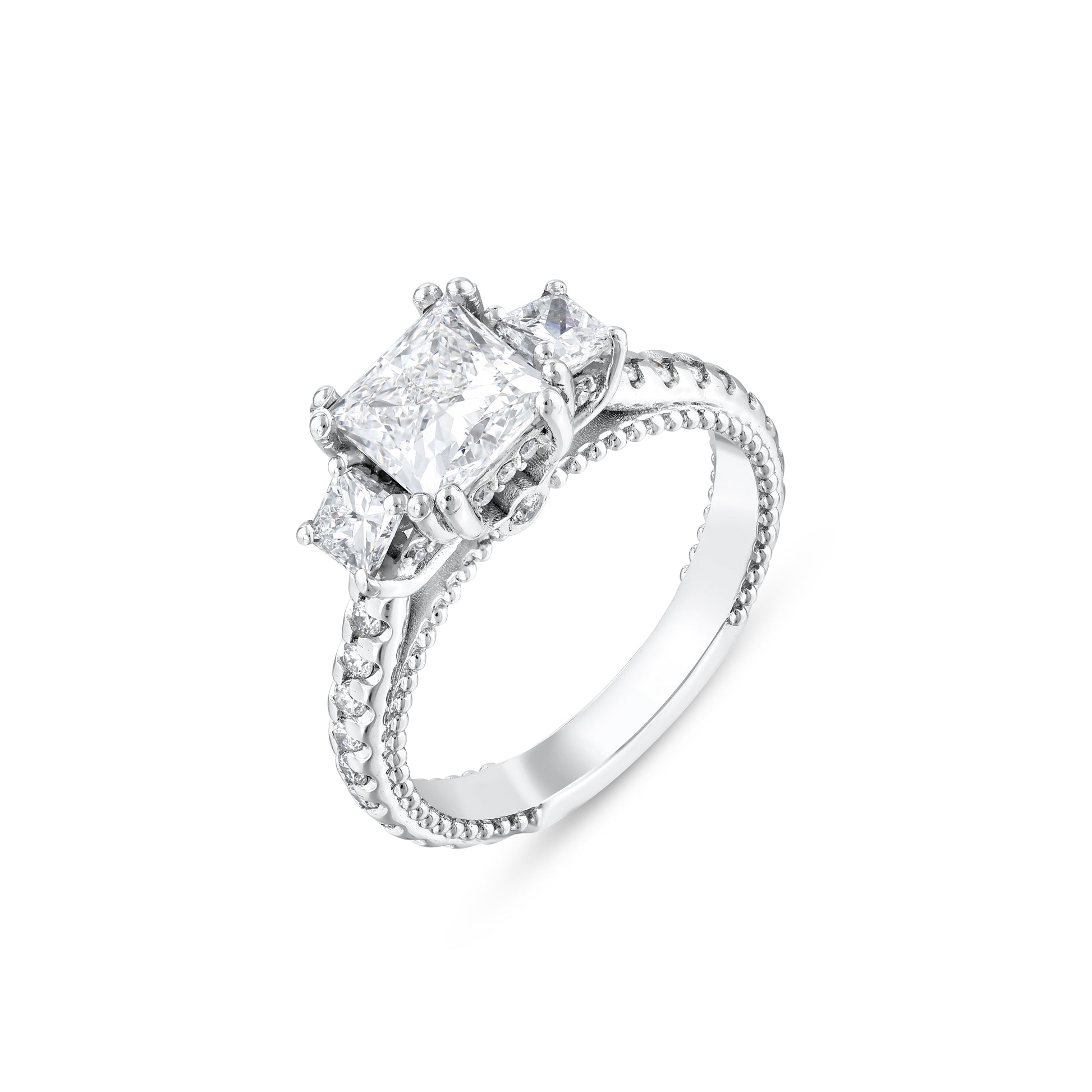 This elegant ring features a 1.54ct D color, VS1 clarity center diamond, admired for its exceptional brilliance and purity. It is beautifully complemented by 0.45ct of two side diamonds and 0.35ct of smaller princess-cut side diamonds, creating a layered sparkle and refined sophistication.