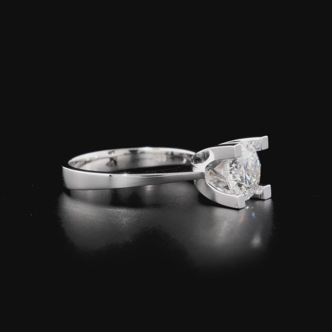 This stunning ring showcases a 1.50ct E color, VS1 clarity round-cut diamond, admired for its exceptional brilliance, fire, and timeless elegance. The expertly cut facets maximize sparkle, creating a dazzling centerpiece that captures attention from every angle.