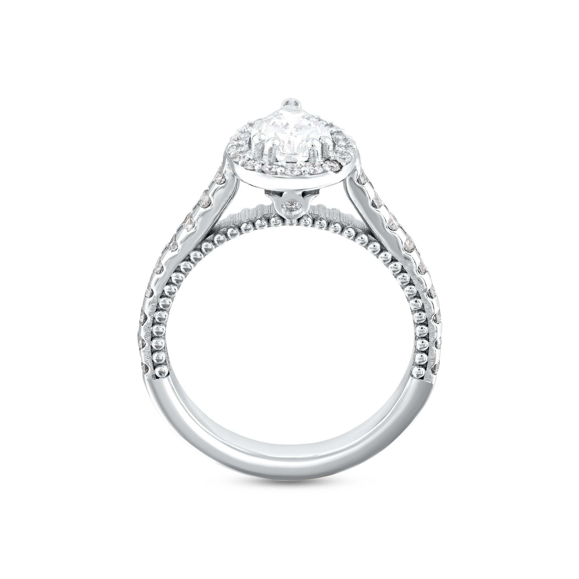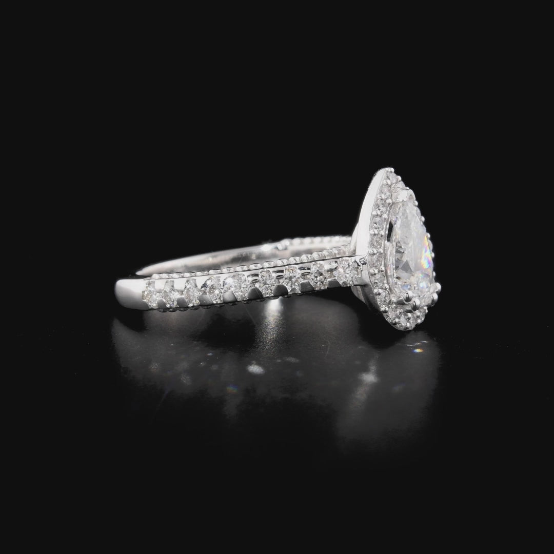 This elegant ring features a 1.02ct D–E color, VS2 clarity pear-cut diamond, admired for its graceful teardrop shape and brilliant sparkle. The unique pear cut combines sophistication and charm, creating a centerpiece that reflects light beautifully from every angle.