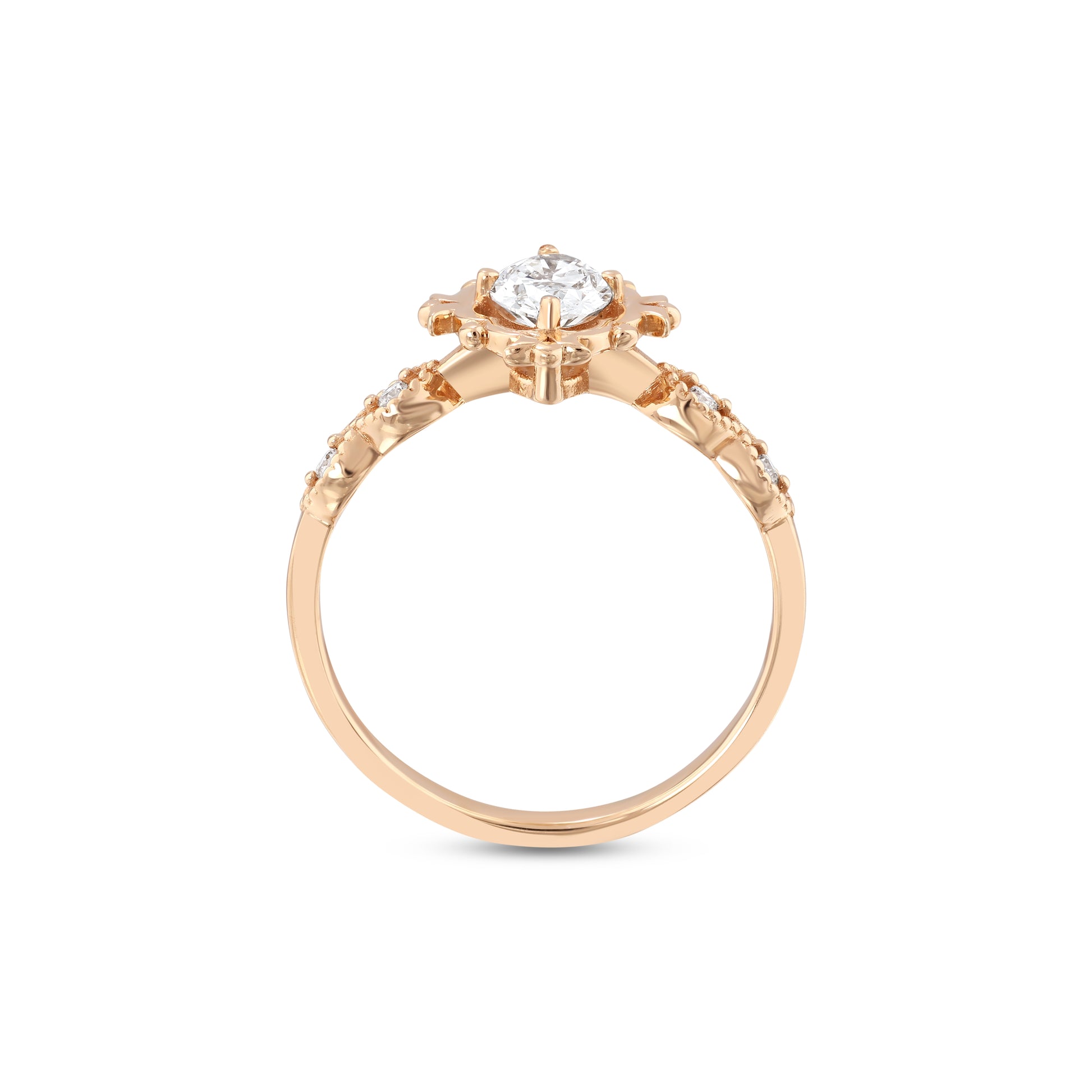 At the heart of this graceful design lies a mesmerizing 0.54ct D–E color, VVS clarity oval-cut center diamond, admired for its extraordinary brilliance and pure elegance. The centerpiece is delicately accented by 0.05ct of side diamonds in matching D–E color and VS clarity, adding a subtle sparkle that enhances the oval cut’s natural fire and beauty.