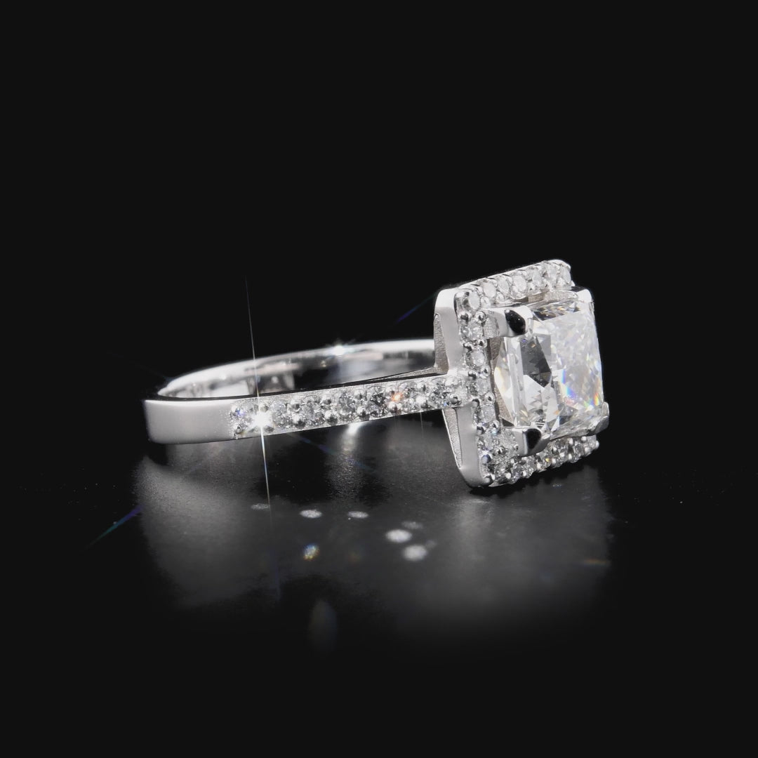 This striking ring features a 2.02ct E color, VS1 clarity princess-cut center diamond, celebrated for its brilliant sparkle, precision-cut facets, and modern elegance. The centerpiece is enhanced by 0.42ct of side diamonds in matching high-quality grades, creating a harmonious balance of fire and sophistication.